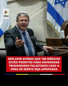 O ministro israelense de extrema direita Itamar Ben-Gvir declarou que cerca de 100 médicos israelenses lhe disseram estar dispostos a administrar injeções letais em prisioneiros palestinos, caso a execução seja autorizada. A Associação Médica Mundial condenou a declaração como “repugnante”, enquanto grandes organizações de direitos humanos e o chefe do Sindicato dos Médicos rejeitaram o projeto de lei proposto.