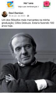 O meu prezado amigo DAVI DAMIAN, sempre muito ligado, hoje lembra que GILLES DELEUZE estaria completando 100 anos. DAVI DAMIAN. que é o mais bem qualificado psicanalista nosso, tanto é Mestre e Doutor pela UFRGS, considera DELEUZE como o filósofo que mais o influenciou. Eu sei que DELEUZE não era psicanalista, mas sua contribuição à psicanálise é fabulosa.
